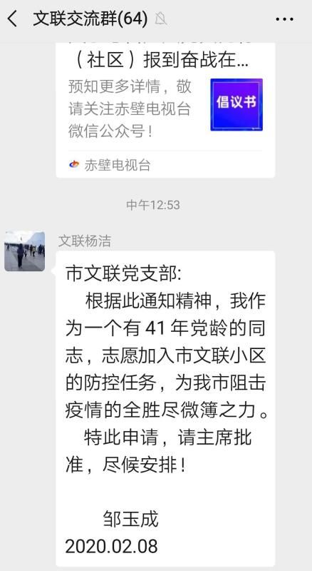 “我作为一个有41年党龄的同志,志愿加入市文联小区的防控任务,为我市阻击疫情的全胜尽微薄之力……”