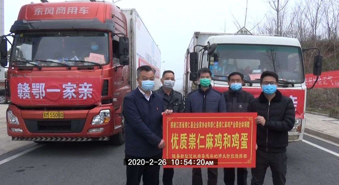 这批鸡肉和鸡蛋是由江西省崇仁县企业家协会和崇仁麻鸡产业联合体捐赠的,江西省发改委社会发展处副处长、江西援随医疗队前方指挥部龙菊香代表崇仁县捐赠的。龙菊香介绍,崇仁县委县政府积极贯彻江西省委省政府关于把随州市当成江西第12个地市的有关指示精神,积极发动企业献爱心,援助随州抗击疫情。为了准备这批鸡肉和鸡蛋,保证食材新鲜,崇仁县昨日紧急抽调人手,当天宰杀装运,调用两辆冷冻车,于今日凌晨出发,一路奔驰近10个小时送抵随县。