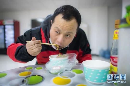△忙碌一天后,刘森波在实验室食堂吃晚饭