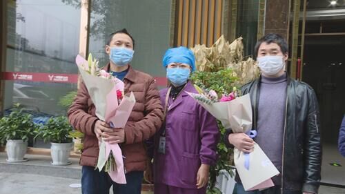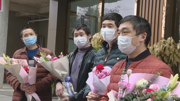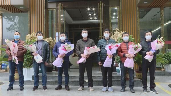 当天下午3时,这7名建设者在办理好相关手续后走出指定隔离酒店,医护人员和工作人员为他们送上鲜花,欢送他们回家与家人团聚。这7名建设者于1月31日前往武汉援建雷神山医院,主要负责弱电安装,经过11天鏖战,圆满完成援建任务。