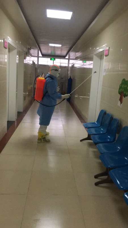 2.27日下午,县妇幼保健院(传染病隔离二区)病区保洁员刘海本正在病区进行消毒工作。(杨双宏摄)