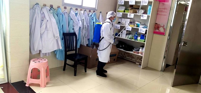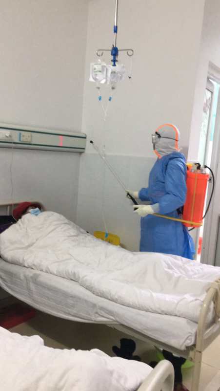2.28日上午午,县妇幼保健院(传染病隔离二区)病区保洁员杨双宏正在病房内进行消毒工作。(陈雨摄)