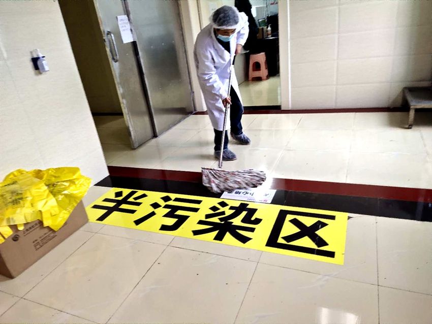 据了解,在隔离病区二区进行卫生打扫的共有6位工作人员,他们轮班分批次进入病区,互相配合,从清扫消毒到医疗废弃物处理,作为保洁人员他们也在无畏逆行。