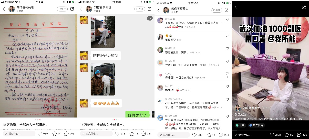 2月27日,小红书博主“知你者葵葵也”晒出了来自湖北省荣军医院手写的感谢信,感谢她和小红书平台对该院物质和精神支持。2月20日,葵葵向荣军医院捐出了价值15万元的医疗物资,收到物资后荣军医院护士长王燕萍特地手写了感谢信,信中写道,“源源不断的物资极大保障了医护人员的生命安全,也让我们也感受到了小红书平台源源不断的爱。给予我们物资和精神上的双重鼓舞。”