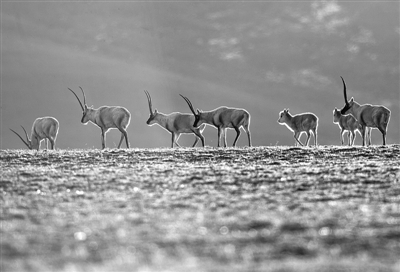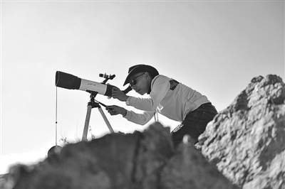 志愿者在青海省玉树藏族自治州境内的一处山峰上观察动物 新华社发
