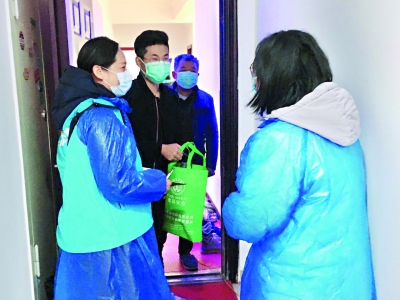 网格员张南洪(左一)为疫情期间留汉孕妇上门提供帮助 李欢 摄