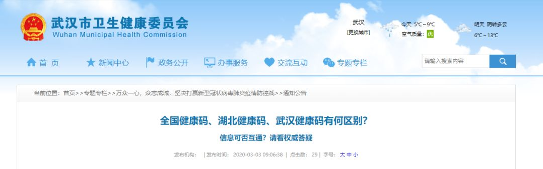 2月29日晚,帐号主体为"武汉市人民政府总值班室"的公众号"武汉市长专线"对健康码进行权威解读。全文如下: