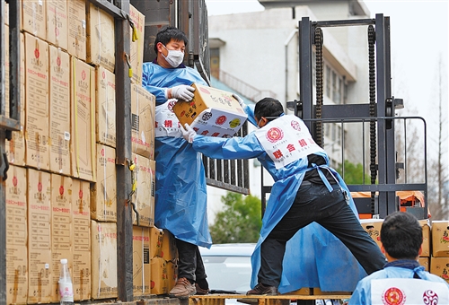 3月3日,武汉市青山区武粮仓库,志愿者在搬运捐赠的水果等物资。记者 高兴贵摄
