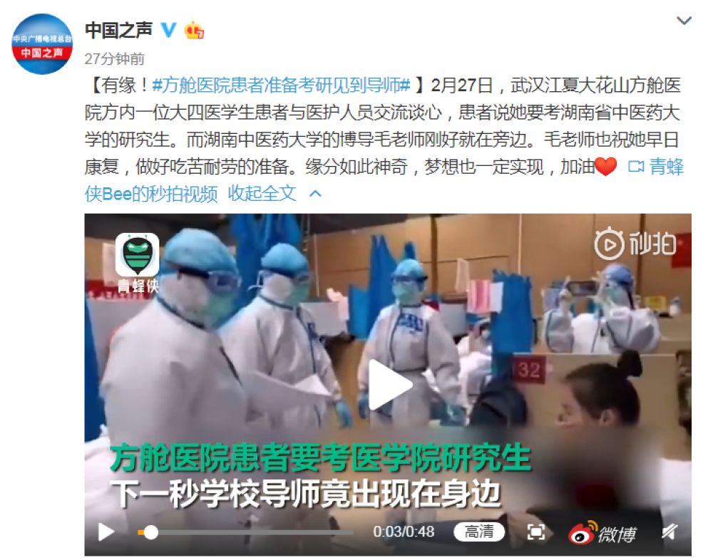 2月27日,武汉江夏大花山方舱医院方内一位大四医学生患者与医护人员交流谈心,患者说她要考湖南省中医药大学的研究生。而湖南中医药大学的博导毛老师刚好就在旁边。毛老师也祝她早日康复,做好吃苦耐劳的准备。
