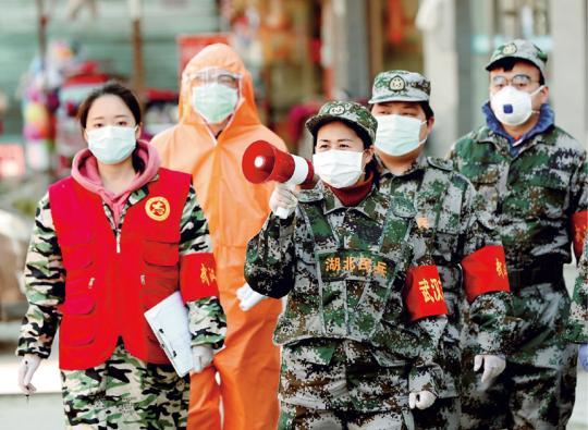 疫情防控阻击战打响后,湖北省武汉市江岸区人武部每天组织300多名民兵24小时值守在全区17个街道52个疫情防控值勤点岗位,宣传新冠肺炎疫情防控、测量体温、排查登记居民信息,为居民送菜代购生活物资和药品、为社区居民守好健康之门,筑起疫情防控的铜墙铁壁。图为2020年2月20日,江岸区人武部组织民兵在后湖南街建设新村社区宣传疫情防控。 湖北日报记者 张鸿/摄