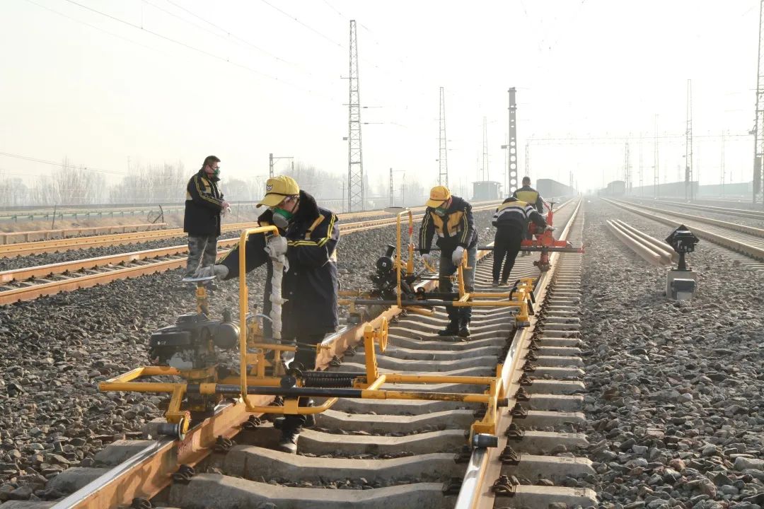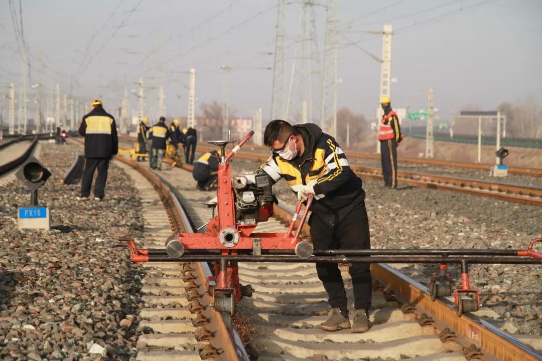 2月27日清晨,在京包铁路呼和浩特南站,呼和浩特工务段机械化维修车间钢轨修磨工区的线路工全副武装,操纵着3台钢轨打磨机对病害钢轨进行打磨。