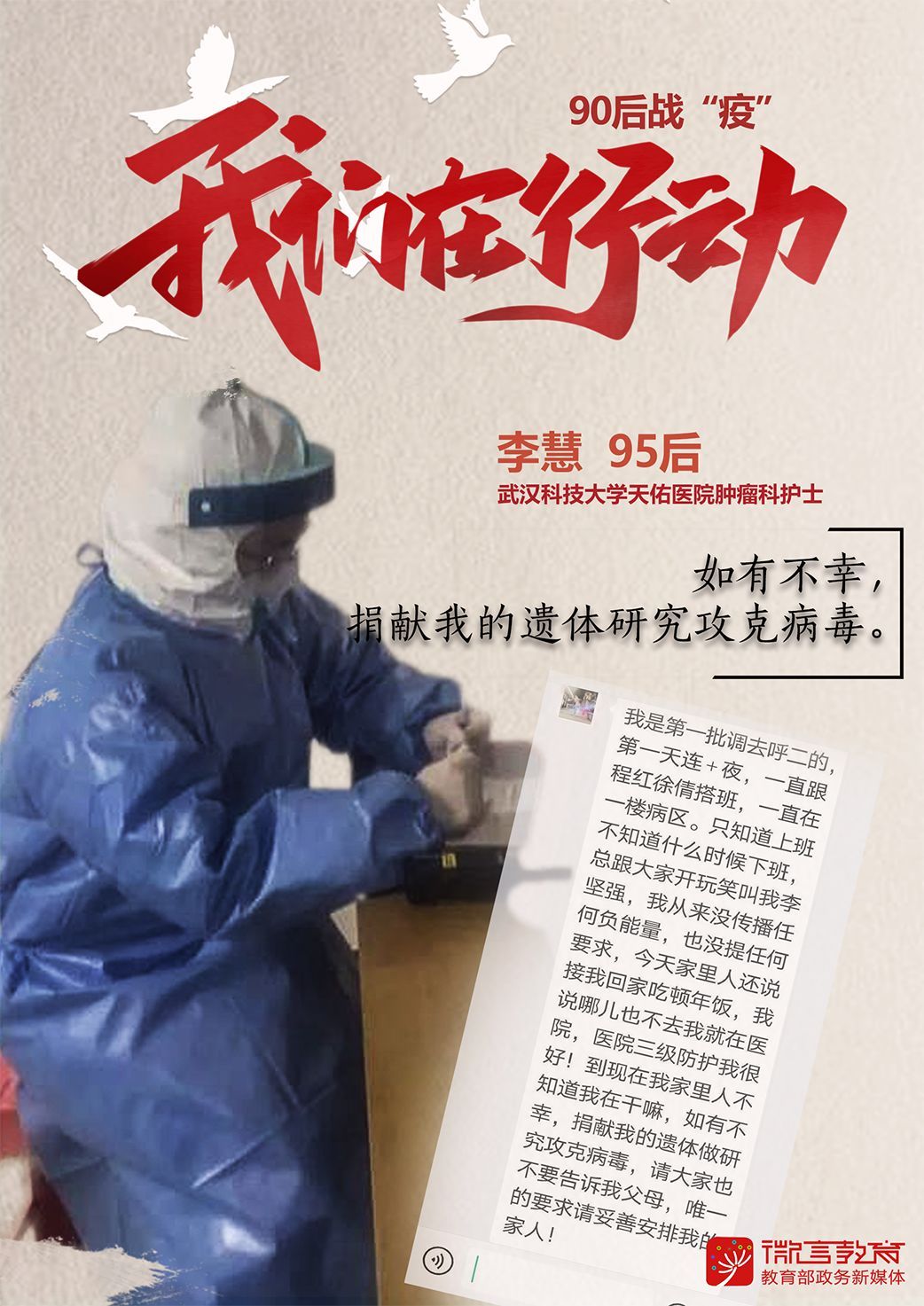 李慧在医院征集志愿者时,给护理部发了一段话,要求到任务较重的呼吸二病区参与一线工作,并要求不要告知家人。