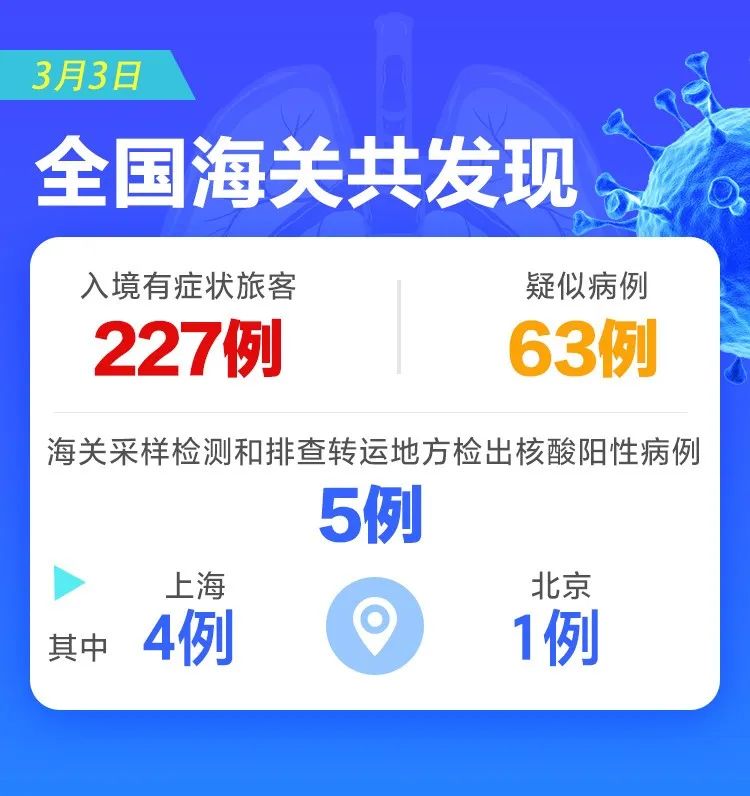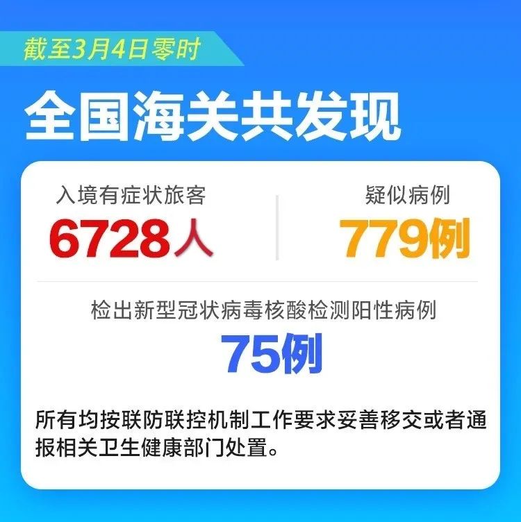 据了解,疫情发生以来,海关全面启动健康申报制度,对所有出入境人员严格实施“三查、三排、一转运”检疫措施。“三查”就是百分之百查验健康申报,全面开展体温监测筛查,严密实施医学巡查。“三排”就是对“三查”当中发现的有症状的,或者是来自于疫情比较严重的国家或地区,或者是接触过确诊病例、疑似病例的人员,严格实施流行病学排查、医学排查以及实验室检测进行排查。“一转运”,就是对 “三排”当中判定的确诊病例、疑似病例、有症状人员、密切接触者“四类人员”一律按照联防联控机制要求落实转运、隔离、留观等防控措施。
