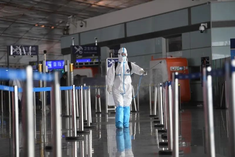 北京海关关员对旅检通道进行卫生处理 摄影/邓旭