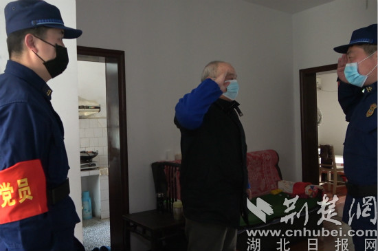 荆楚网客户端-荆楚网消息(通讯员蔡久勇)“谢谢你们,我给你们敬个礼!”3月5日,潜江市金陵寺社区一居民楼内,75岁的程老爷子对着送来米面的“119党员突击队”消防指战员行了个军礼。