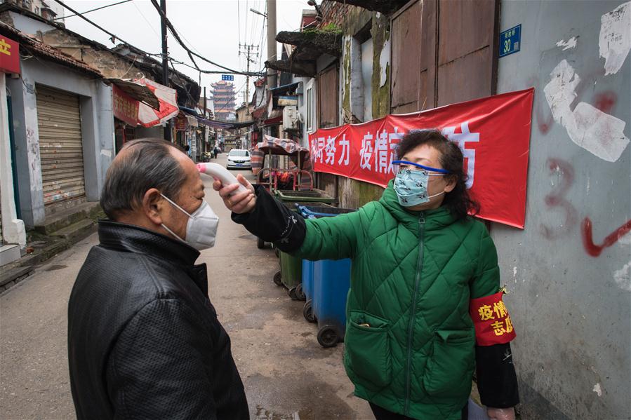 武汉西城壕社区网格员曹岚英(右)为居民测量体温(2月7日摄)。 新华社记者 肖艺九 摄