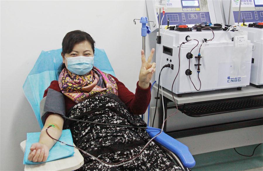 金银潭医院院长张定宇的妻子程琳在捐献血浆(2月18日摄)。 新华社记者 才扬 摄