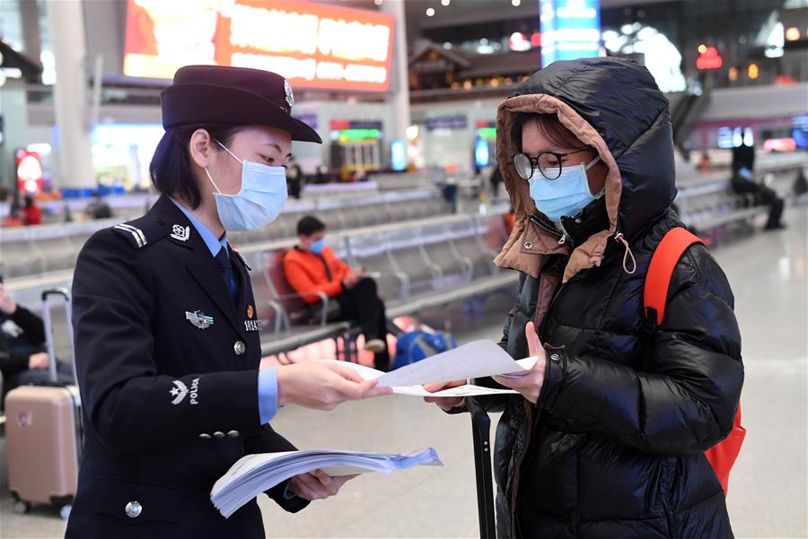 在广西南宁东站,南宁铁路公安处女民警花子惠(左)将自己创作的疫情防控宣传漫画送给乘客(2月4日摄)。 (配本社同题文字稿) 新华社记者 陆波岸 摄
