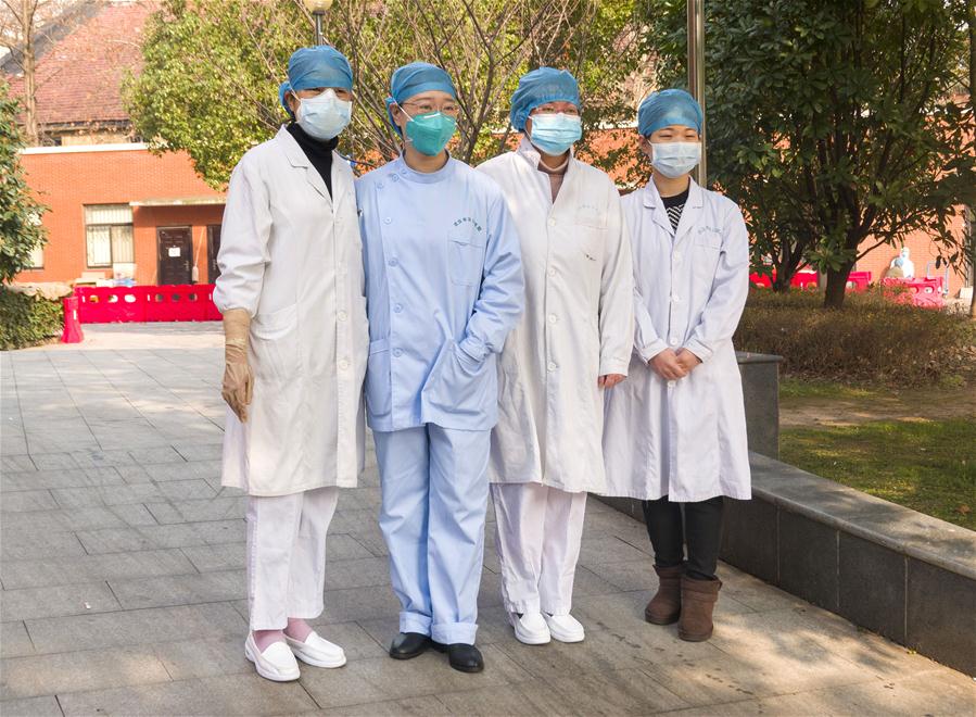 曾感染新型冠状病毒的返岗医护人员蔡桃英、杨丽、张晶、栾佳文(由左至右)在武汉市汉口医院合影(2月22日摄)。 新华社记者 才扬 摄