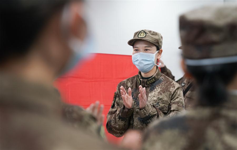 在武汉金银潭医院,军队支援湖北医疗队队员宋彩萍鼓励大家奋勇努力,战胜疫情(2月1日摄)。 新华社记者 程敏 摄