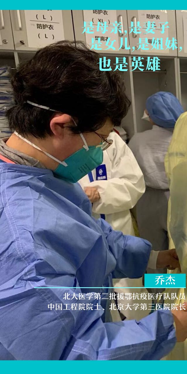 中国工程院院士、北京大学第三医院院长乔杰在2月初便奔赴战场,驻守武汉。她是北京大学援鄂抗疫医疗队领导组组长,北医三院医疗队的大家长,是队员们的主心骨。创建传染病危重症救治新单元,连续两次开辟新战场,医疗质量要求高,工作风险大。