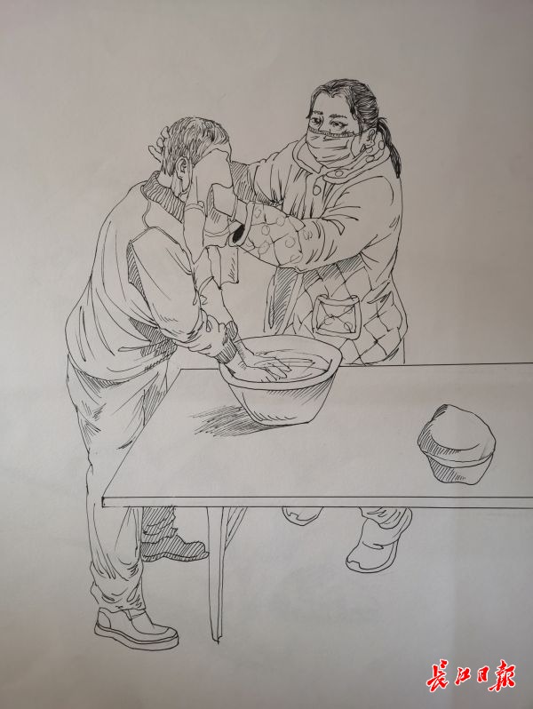 张大姐出舱的前几天,给那位爷爷洗脸时,被其他病友“偷拍”了下来,发到了群里。“看到那张照片,我感动了。”史云奇说,她把那张照片保存在手机里,回驻地后,连夜用水笔临摹了一幅画。