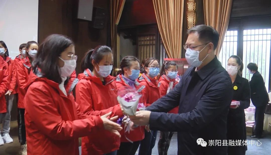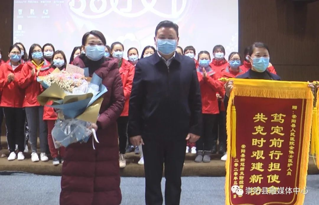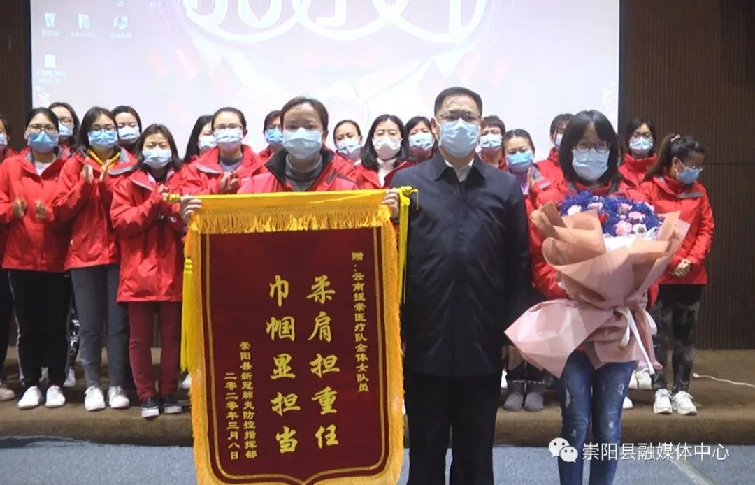 活动中,县委副书记、县长郑俊华向云南援崇医疗队赠授“柔肩担重任·巾帼显担当”感谢锦旗,县委副书记、县委政法委书记程冰野为崇阳县人民医院授予“巾帼建功集体”荣誉锦旗,同时,向每一位云南援崇医疗队女医护人员和奋战在战“疫”最前线的女医生、女护士代表送上了鲜花和节日礼物。