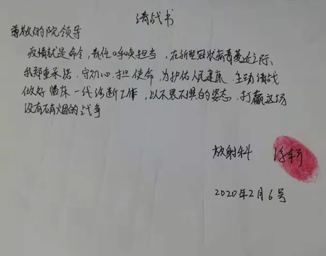 在疫情最紧急的时候,全院200多位医护人员主动请缨加入“战斗”,一笔笔签名,一个个红手印,彰显的是责任,是面对疫情时绝不退缩的坚强担当!