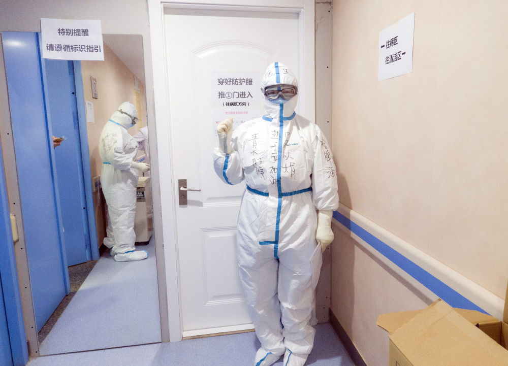 2月20日,在华中科技大学同济医院光谷院区,一名医护人员在进入病区前为自己加油。新华社记者 才扬 摄