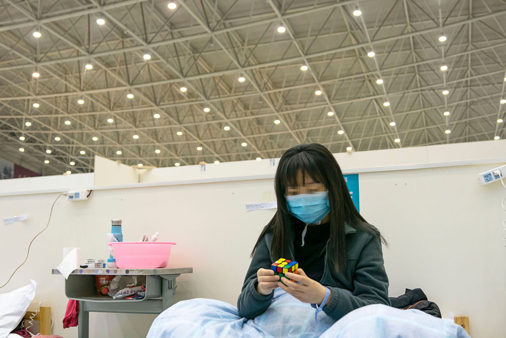 2月10日,向女士在武汉客厅方舱医院玩魔方。新华社发