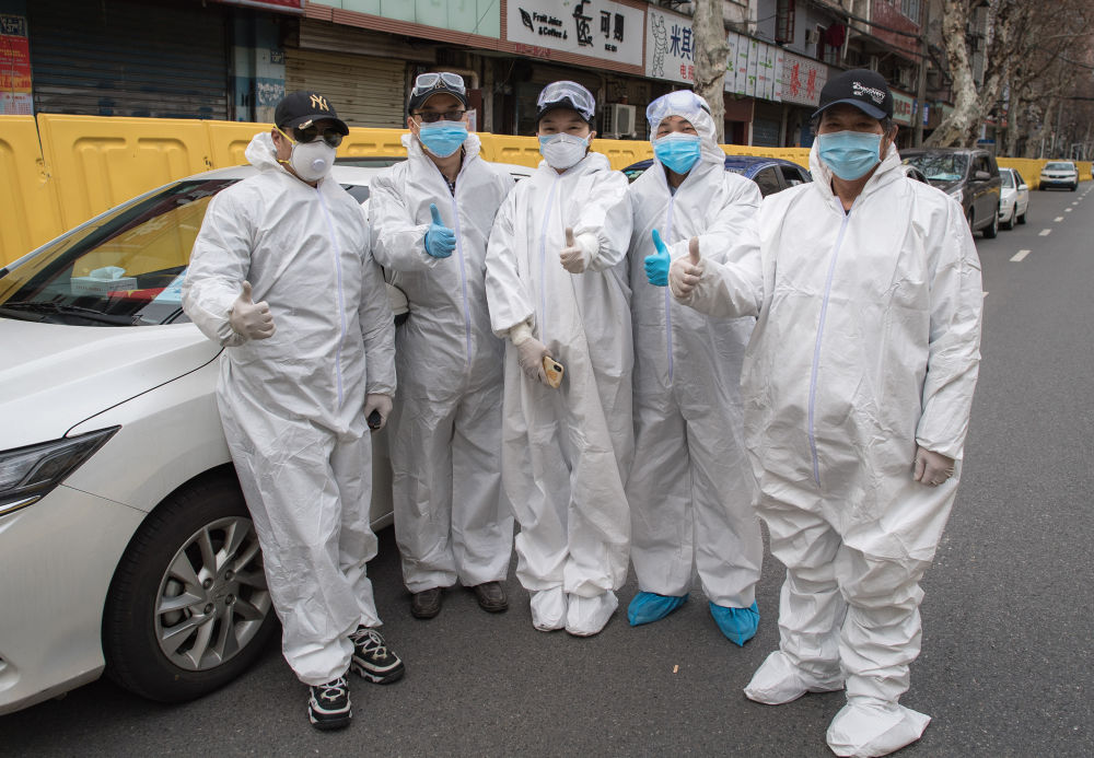 2月29日,“W大武汉紧急救援队”队员李文建、朱伟、王紫懿、王震、杨学彬(从左至右)为武汉加油打气。新华社记者 肖艺九 摄