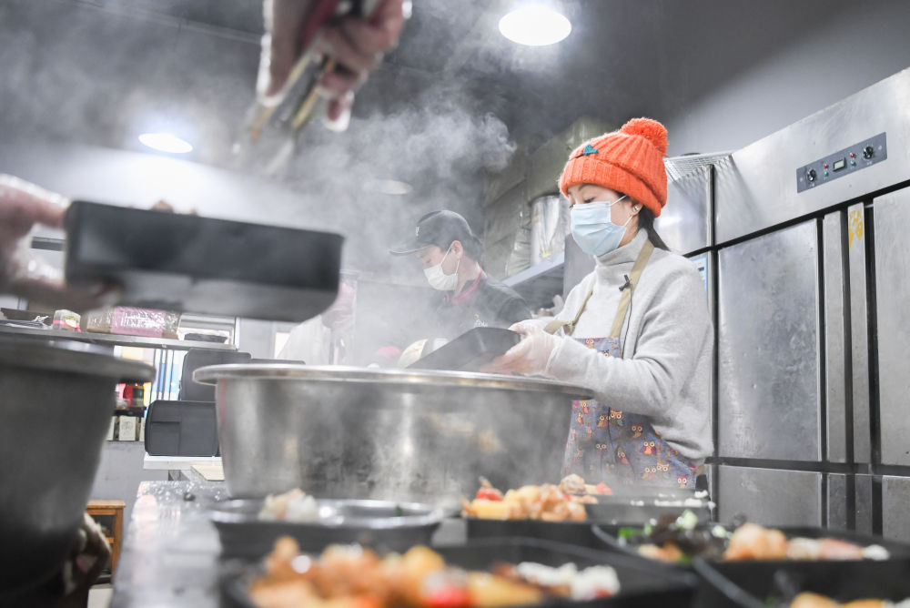2月26日,“雨衣妹妹”(右)在分装盒饭。新华社记者 程敏 摄