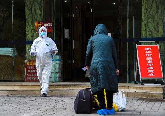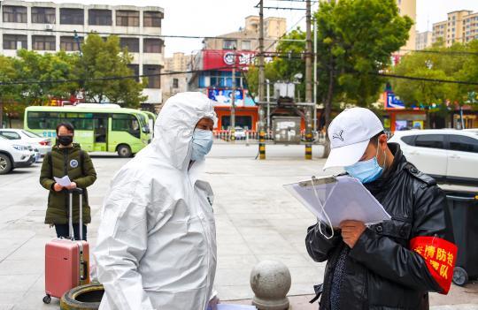 在孝感市城区的一处“康复驿站”隔离点,志愿者向军提醒出院患者下车(3月8日摄)。出院患者只能在相应的隔离点下车。