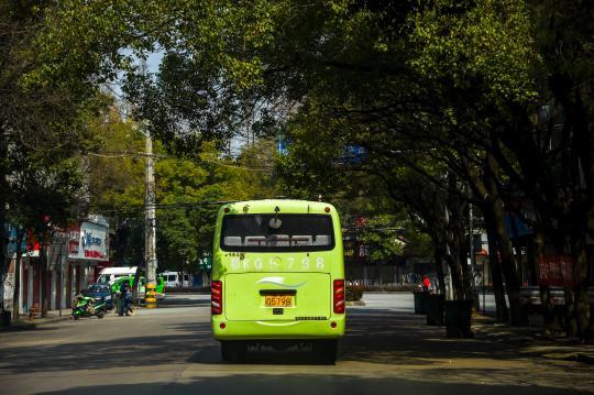 载有出院患者的大巴行驶在孝感市城区(3月7日摄)。