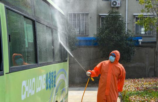 当日转运护送出院患者任务结束后,孝感市中心医院东南院区的工作人员对大巴消毒(3月7日摄)。