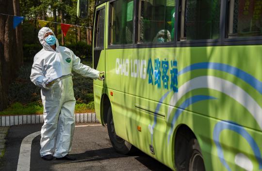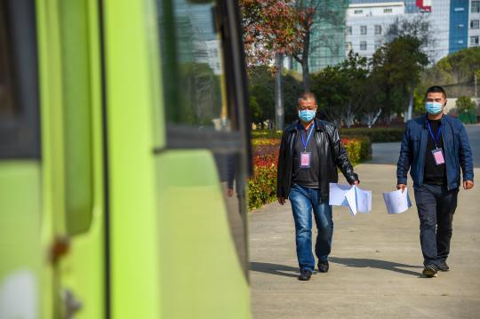 发车前,工作人员先与出院患者所属社区或乡镇联系,核对并确认相应的“康复驿站”隔离点。然后,向军再和同伴讨论行车路线,分配车次,核对人员信息。待当日出院患者全部上车后,发车驶向目的地。