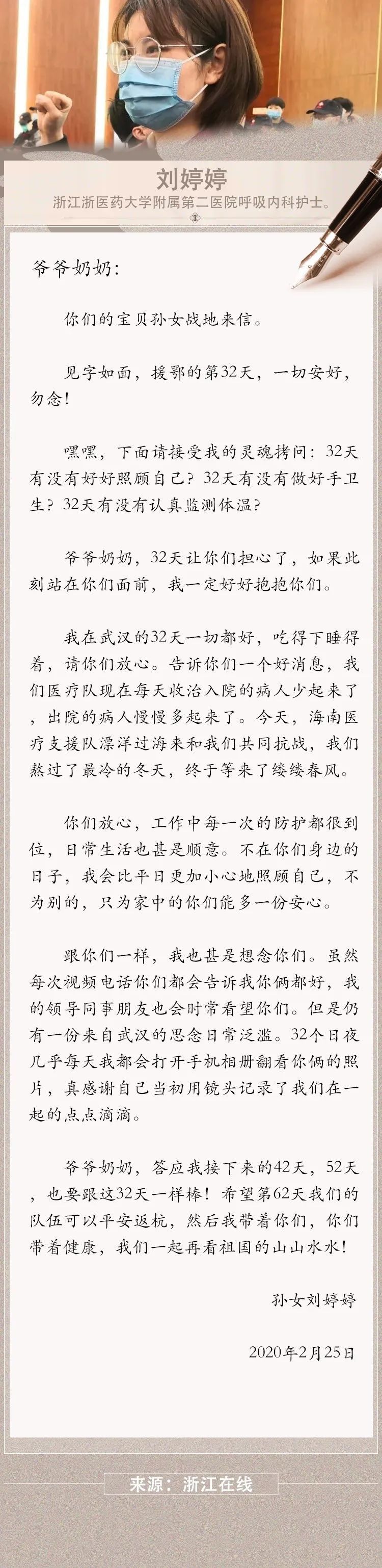 除夕之夜,她主动在请战书上签下名字,要求支援武汉。1月25日,跟随浙江省抗击新冠肺炎紧急医疗队前往武汉。