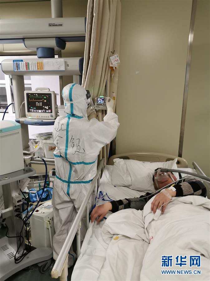 1月31日,在武汉协和江北医院重症监护室,金钰在照顾病人。新华社发