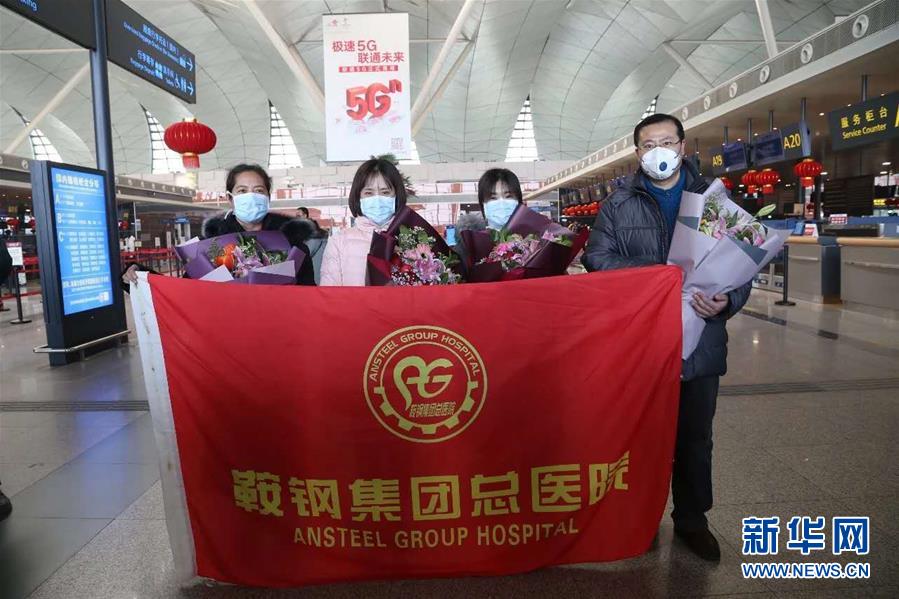 在辽宁沈阳桃仙国际机场,金钰(左二)奔赴武汉前与同事合影(1月26日摄)。新华社发