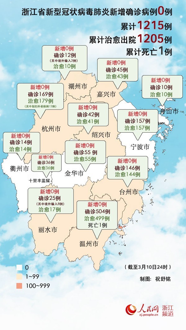 截至3月10日24时,浙江省累计报告新型冠状病毒肺炎确诊病例1215例(其中境外输入病例10例),现有重症病例2例(其中危重1例),累计死亡1例,累计出院1205例。其中: