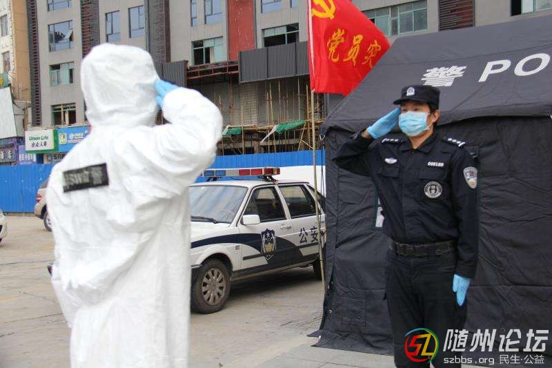 随州市公安局特警支队每日组织48名民警,分别值守艳阳天、都市澜亭酒店等6处新冠肺炎治愈、疑似患者和密切接触者隔离留观据点,严格留观人员管控,切断病毒传播途径。图为3月12日,民警在隔离留观据点交接班时相互敬礼。 (全媒记者李文军、通讯员刘智明摄)