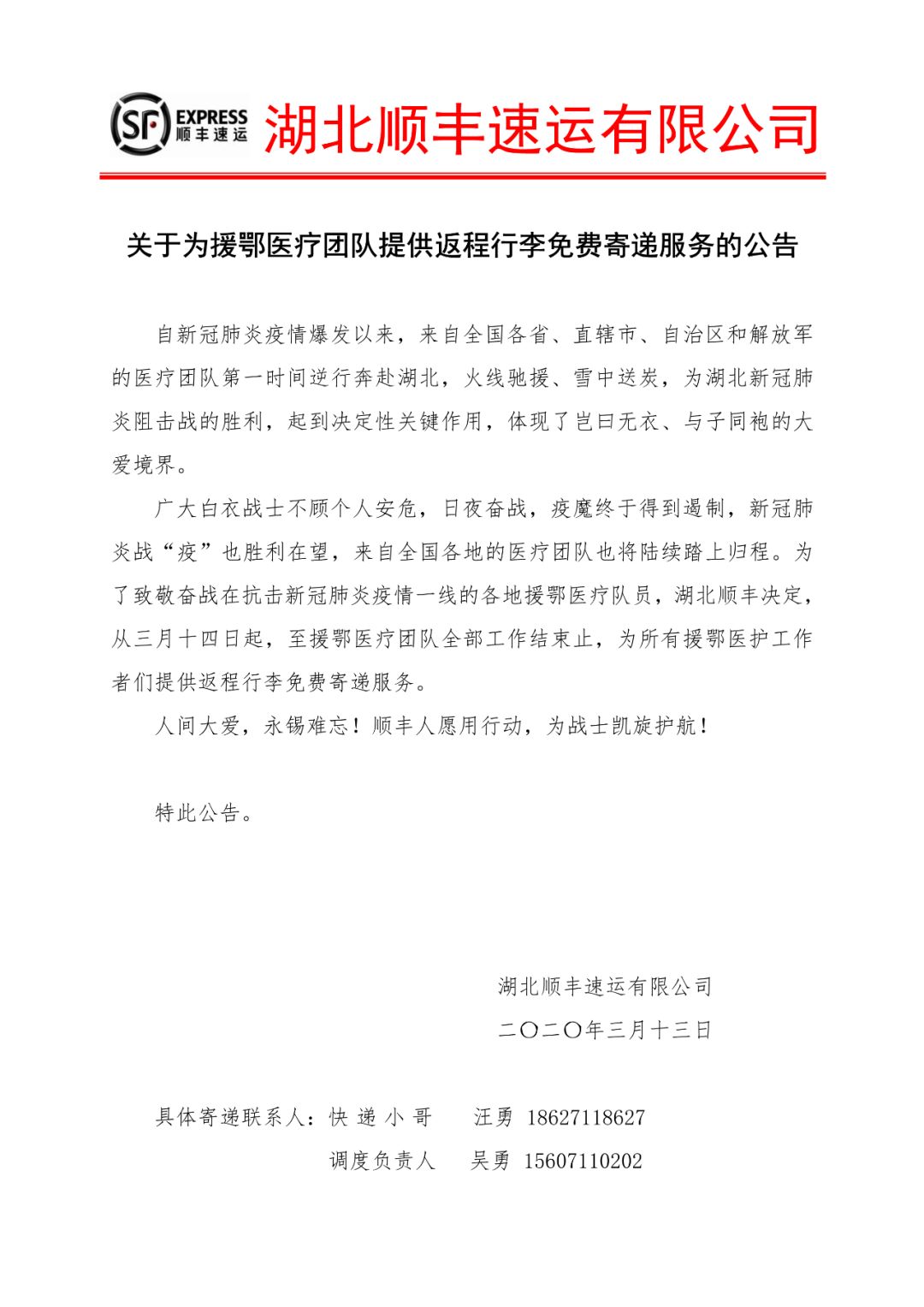 近日,武汉16家方舱医院全部休舱,随着湖北省新冠肺炎疫情回落好转,湖北顺丰对外公告决定,自3月14日起,为所有援鄂医疗团队提供返程行李免费寄递服务,以实际行动致敬不顾个人安危,逆行奋战在抗疫一线的白衣天使们。广大医护人员可以按公告指指引办理服务。