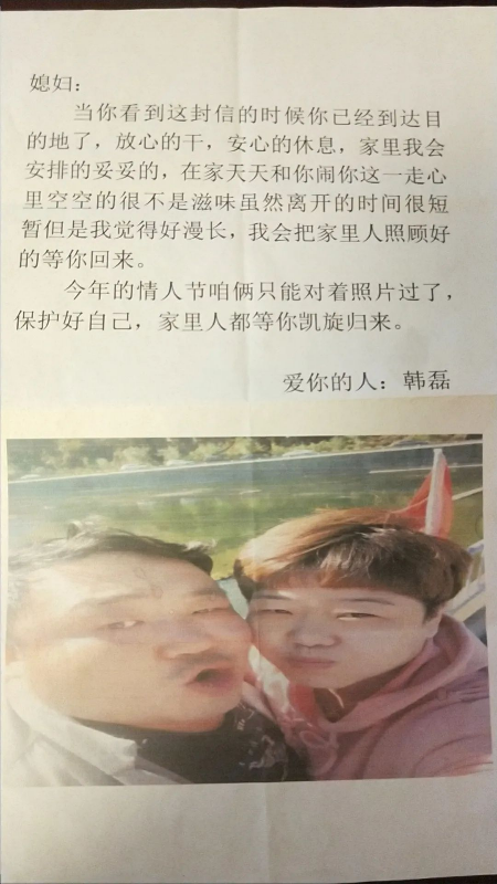 在武汉这些天,万娟一直没有收拾东西,在爱人的提示下,她找到了藏在衣服里的信。上面是一张两人的合影,还有韩磊写给自己的一段话: