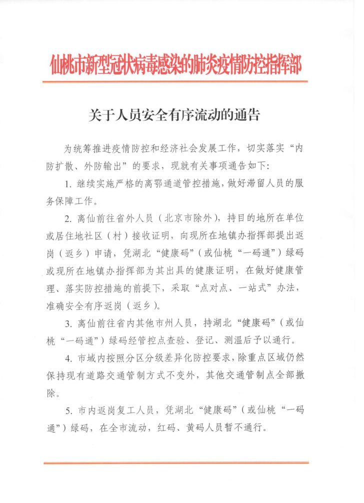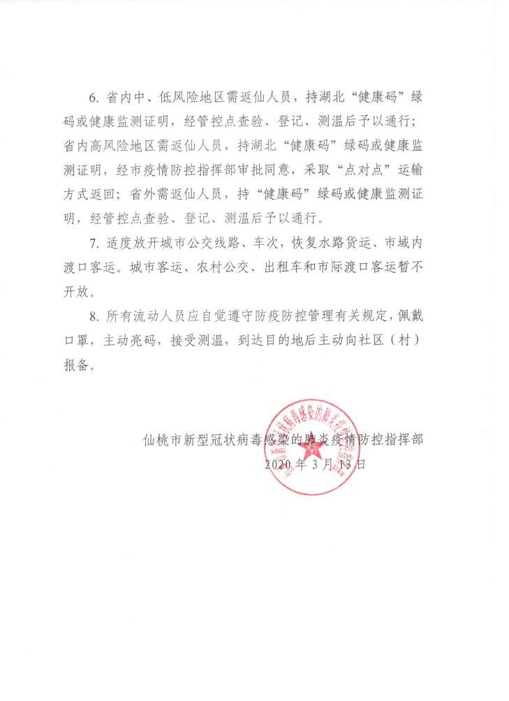 5. 市内返岗复工人员,凭湖北“健康码”(或仙桃“一码通”)绿码,在全市流动,红码、黄码人员暂不通行。