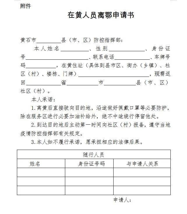六、严格管控在黄人员及车辆离鄂通道。在黄滞留人员及车辆离鄂(北京市除外),凭司乘人员健康“绿码”、接收地单位或社区(村)接收证明(注明全部司乘人员相关信息)向现居住地所在县(市、区)指挥部提出离鄂申请(附件:在黄人员离鄂申请书),现居住地所在县(市、区)指挥部为离鄂人员出具健康证明,采取“点对点、一站式”办法,经测温查验登记后离黄。