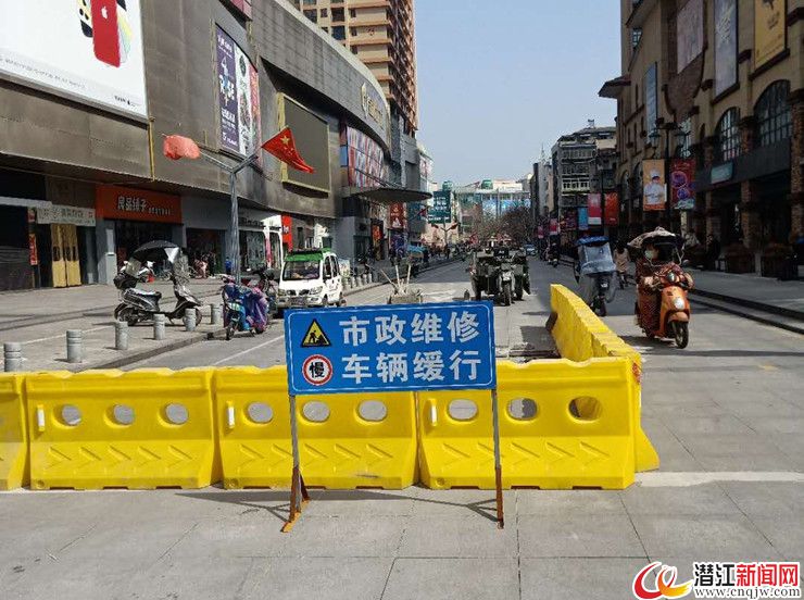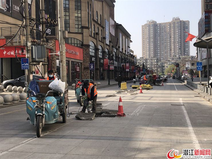 潜江新闻网讯(通讯员 张随)3月14日上午,笔者在园林北路看到,道路两侧被设置了引导围挡,一批工程车辆穿梭其中,市政维修工作人员正在对道路上破损的石板进行维修。