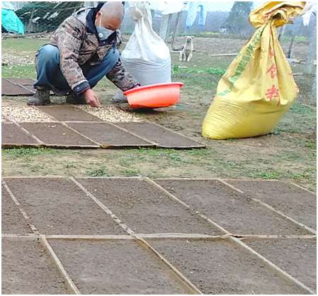 曹场村五组村民王才远,是村里的种植大户之一,也是个有着十多年水稻育秧经验的“土专家”。这两天,他和妻子一起抢抓农时,忙着育苗、浇水、装营养盘、铺设保温膜等,预计旱秧苗一周左右就会发青,四月中下旬就可以移栽到大田。