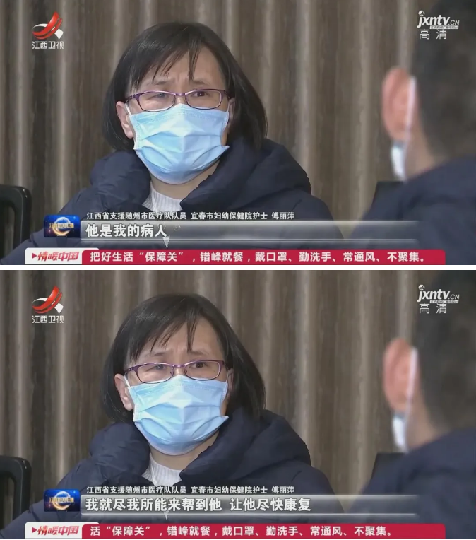 江西省支援随州市医疗队队员 宜春市妇幼保健院护士 傅丽萍:我就跟她讲,您放心,他是我的病人,我就尽我所能来帮到他,让他尽快康复。