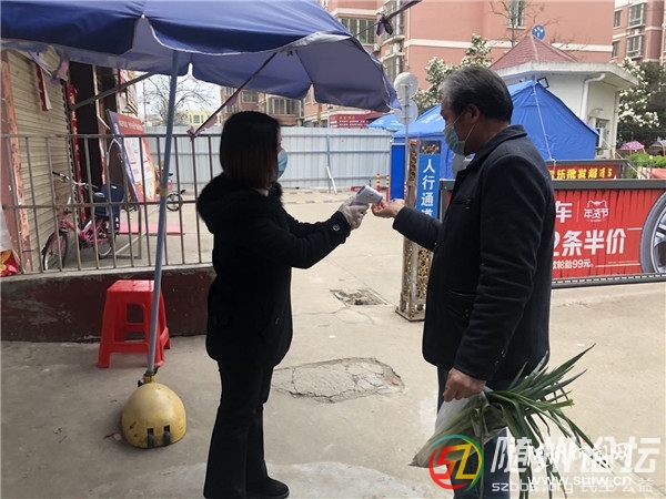 随州日报讯(见习记者 王聪莹)“你好,请出示一下您的健康码,并量一下体温。”3月16日下午,记者在文峰都市花园北门卡口看见,工作人员正在对进出的居民进行检测。