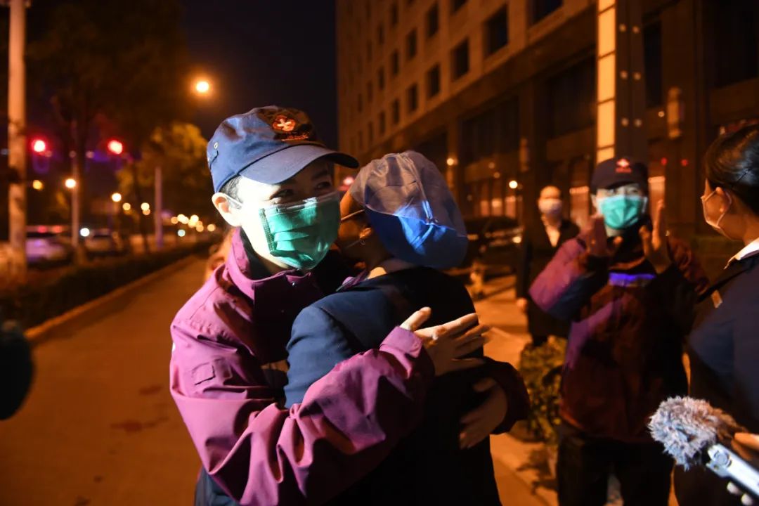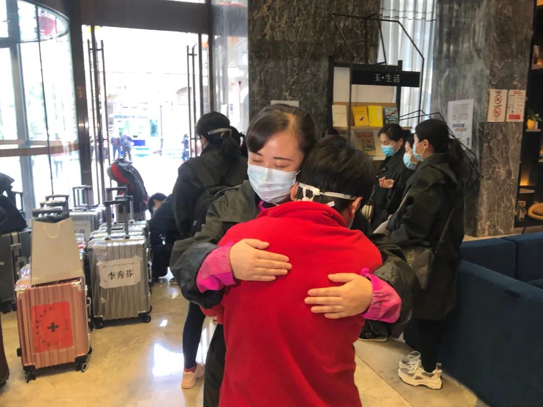 3月17日11时,武汉市武昌区松竹路,玉丰酒店大堂。江西援汉医疗队队员、景德镇市中医院护士郑丽琴,紧紧抱住青海援汉医疗队队员、青海省民和县人民医院护士廖霞。临别诉衷肠,两个人都哭红了双眼。